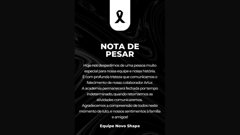 “Hoje nos despedimos de uma pessoa muito especial para nossa equipe e nossa história. É com profunda tristeza que comunicamos o falecimento de nosso colaborador Artur. A academia permanecerá fechada por tempo indeterminado, quando retornarmos as atividades comunicaremos. Agradecemos a compreensão de todos neste momento de luto, e nossos sentimentos à família e amigos”.